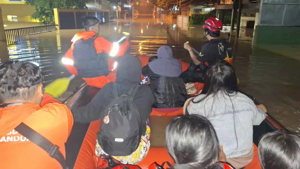Petugas BPBD Kabupaten Bandung mengevakuasi warga terdampak banjir di Kelurahan Andir, Kabupaten Bandung, Jawa Barat, menggunakan perahu karet. Berdasarkan data BPBD, bencana hidrometeorologi itu menyergap 13 Kecamatan di Kabupaten Bandung. Foto: trustjabar/