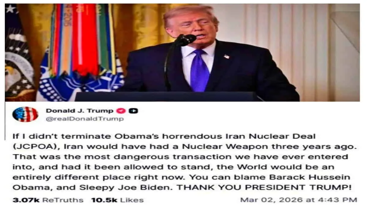 "Jika saya tidak menghentikan Kesepakatan Nuklir Iran (JCPOA) milik Obama yang mengerikan itu, Iran sudah akan memiliki senjata nuklir tiga tahun yang lalu. Itu adalah transaksi paling berbahaya yang pernah kita lakukan. Dan jika dibiarkan berlanjut, dunia akan menjadi tempat yang sangat berbeda sekarang. Kalian bisa menyalahkan Barack Hussein Obama, dan Sleepy Joe Biden" tulis Trump di Truth Social miliknya pada 2 Maret 2026.