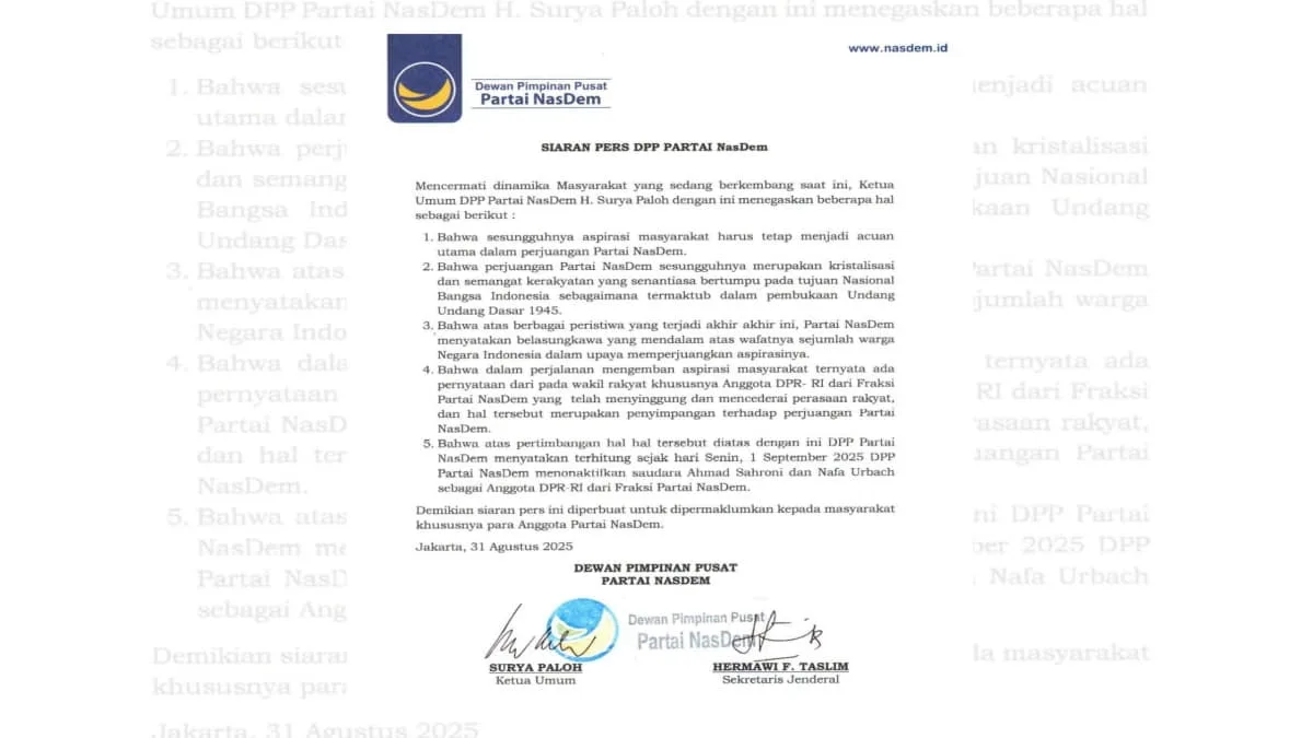 “Bahwa atas pertimbangan hal-hal tersebut, DPP Partai NasDem menonaktifkan Ahmad Sahroni dan Nafa Urbach dari anggota DPR RI Fraksi Partai NasDem. Keputusan ini terhitung sejak 1 September 2025,” tulis dalam siaran pers tersebut. (cep/trustjabar/R1)